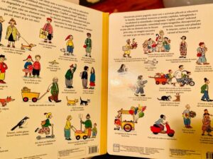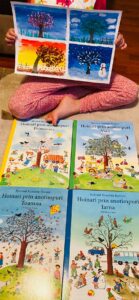Pentru că noi deja am hoinărit câțiva ani prin orășelele pitorești ale acestor cărți, vă las mai jos câteva activități ce le puteți dezvolta cu cei mici la început de “hoinăreală”, până când ei încep să-și dezvolte vocabularul și povestesc singuri. Pe măsură ce copilul crește, povestea poate deveni din ce în ce mai complexă. Începe să capete sens pentru cel mic, reușind să povestească singur ceea ce vede. Din fiecare carte, copilul va învăța și va înțelege ce se întâmplă în fiecare anotimp, ce schimbări intervin în viața oamenilor și ce activități au, ce schimbări intervin în natură, ce se întâmplă cu păsările.