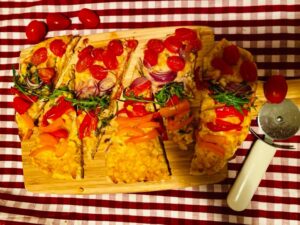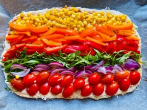Urmează un strat generos de cașcaval și mozzarella, iar la final aranjarea legumelor în funcție de coloritul acestora, astafel încât să rezulte un curcubeu.