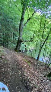 Surpriza a venit atunci când ne-am apropiat de apă și drumul ne-a dus către o potecă îngustă cu înclinație laterala mare, pe alocuri poteca chiar lipsește. Sunt mulți pomi căzuți în cale, râpă în dreapta, multe porțiuni de escaladat, sau coborâri abrupte, porțiune îngustă cu pietre alunecoase. Într-un cuvânt un traseu dificil și chiar dacă era mai scurt, a durat mai mult decât coborârea. Am fi preferat în acest moment traseul mai lung pe care am venit, cu tot cu 1 km în plus ca distanță am fi ajuns mult mai repede și mai ușor.